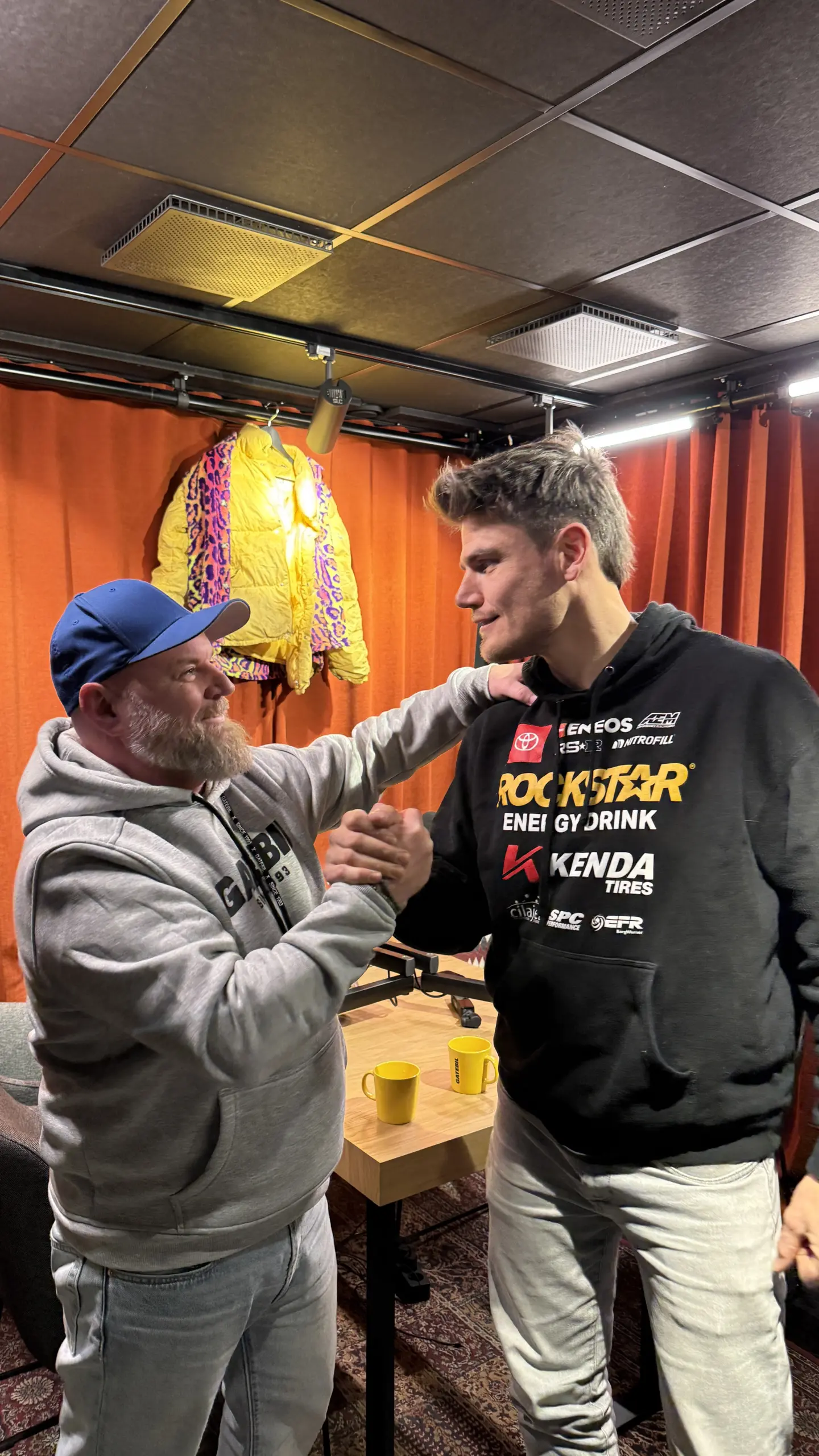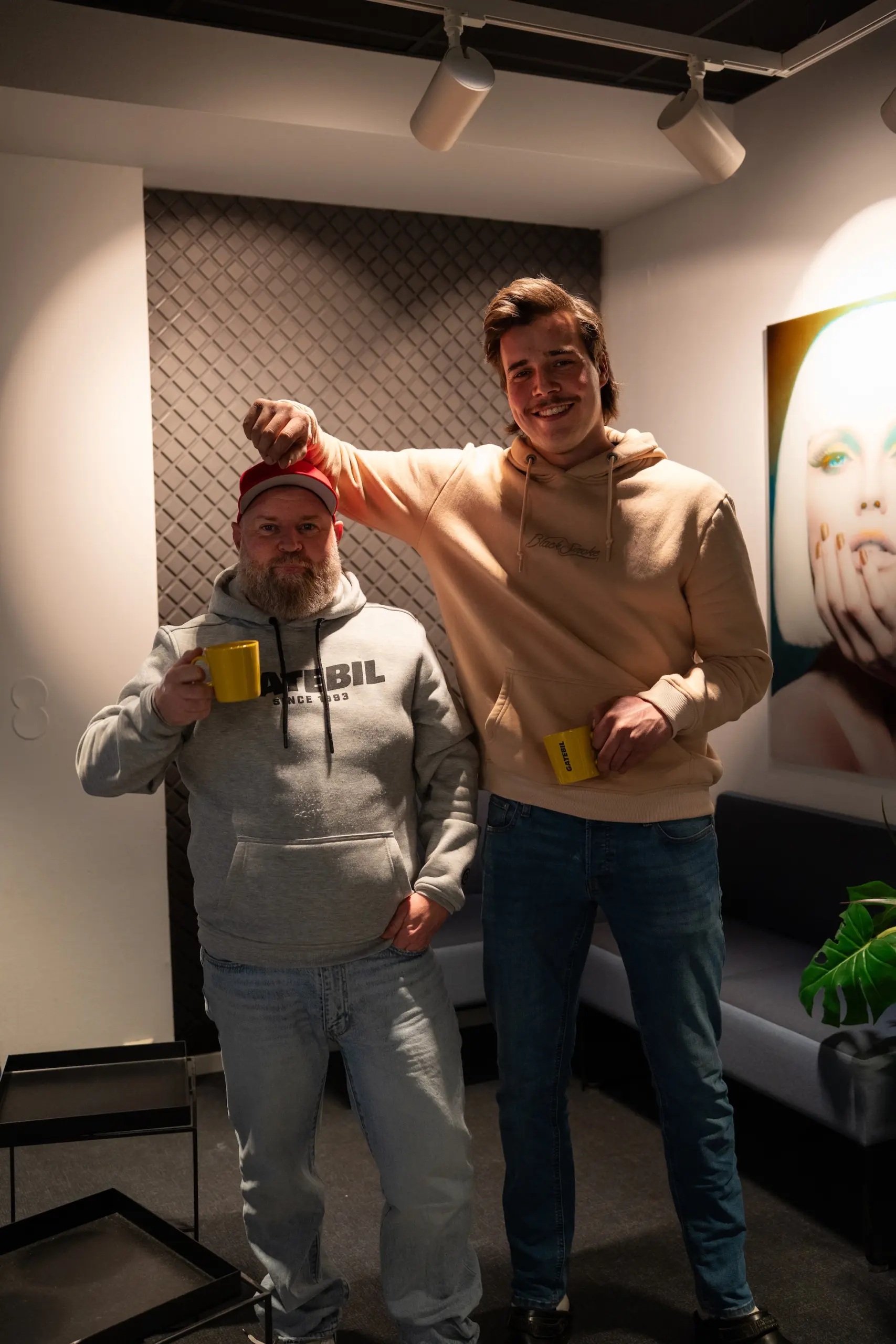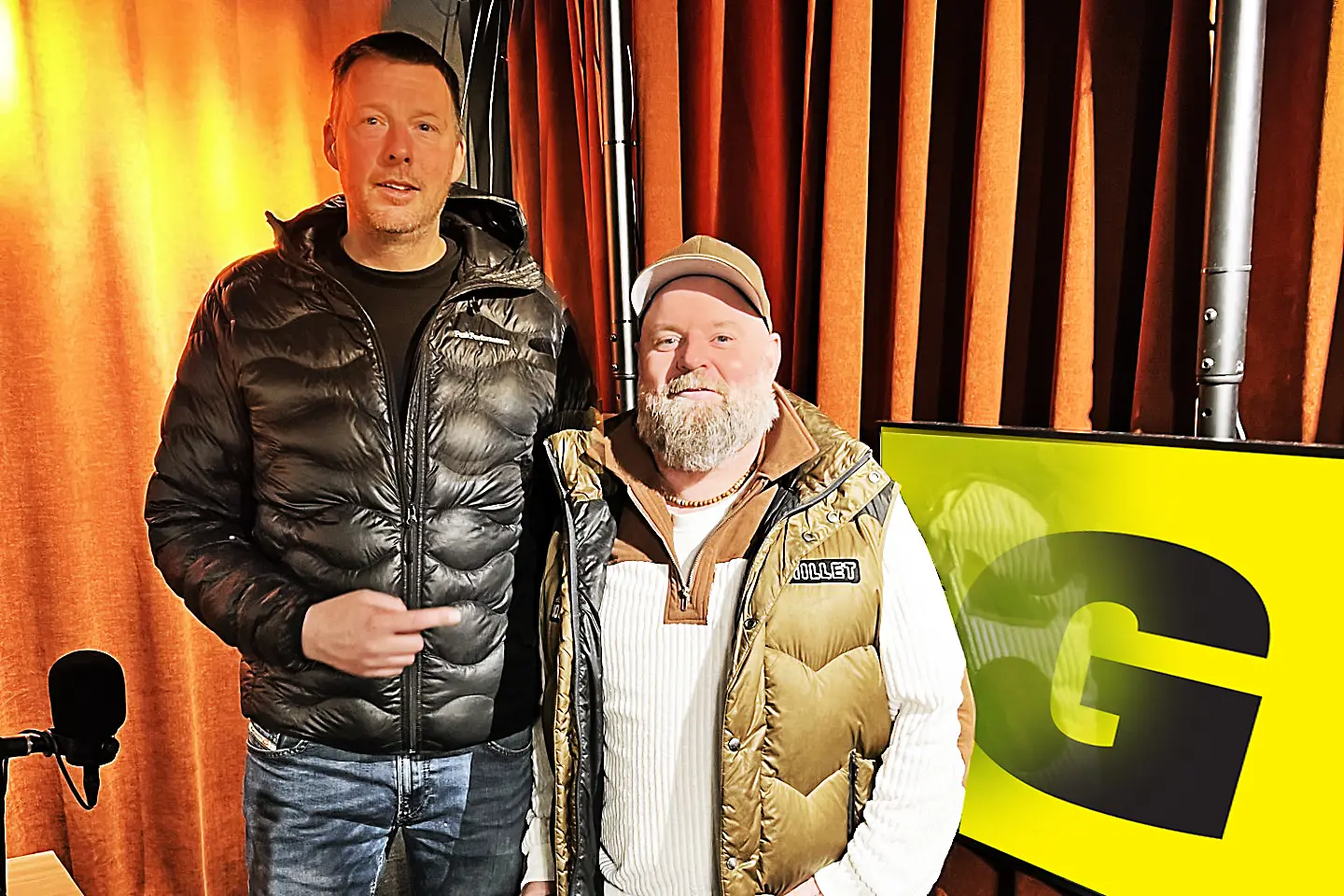 Podkastprogramleder, og Gatebils hus-speaker, Bo André Hagen (her avbildet sammen Gatebil-sjefen, Hans Jørgen Andersson), skal lede gjestene gjennom det vi håper og tror blir en meget underholdende skravle-økt. I bakgrunnen står Bauer Media, som fra før av drifter Radio Norge, Radio Rock, Langkjøring + + +